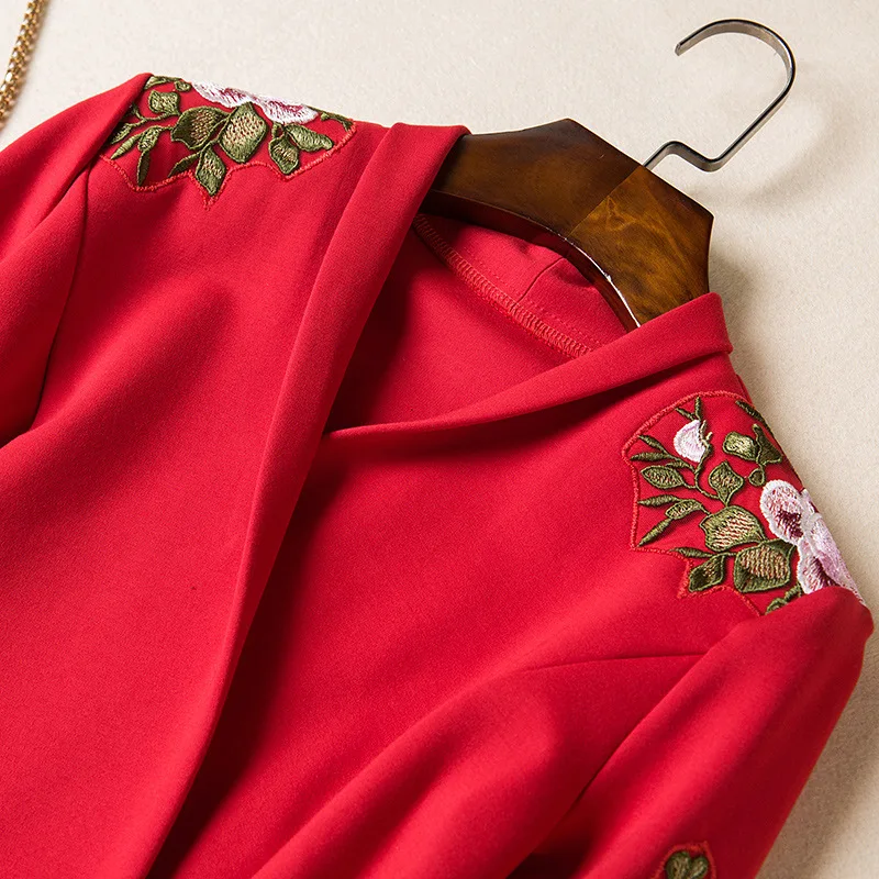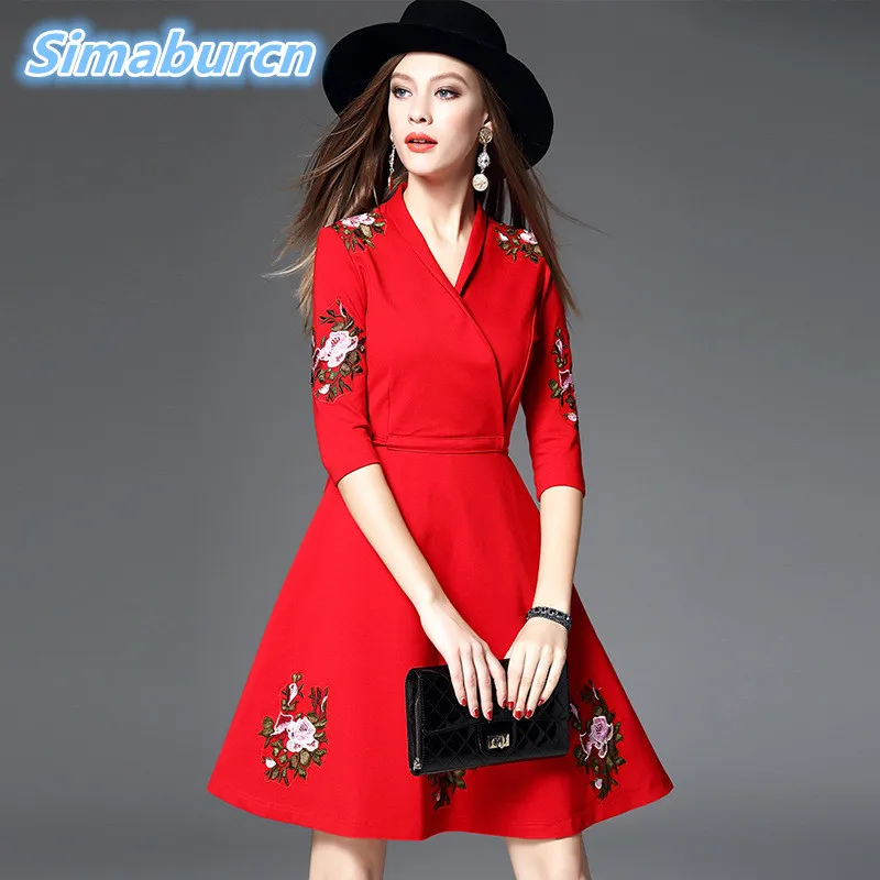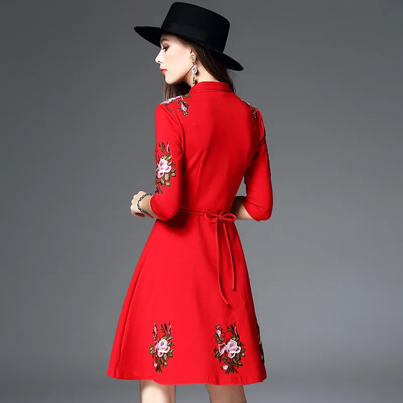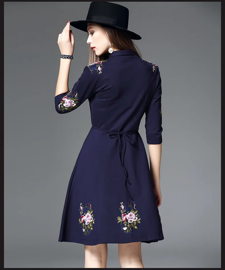 2018 Women Embroidery Dress Autumn Vintage Elegant A-Line 3/4 Sleeve