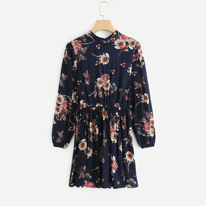 Autumn Floral Women Dress Multicolor Long Sleeve High Waist Loose