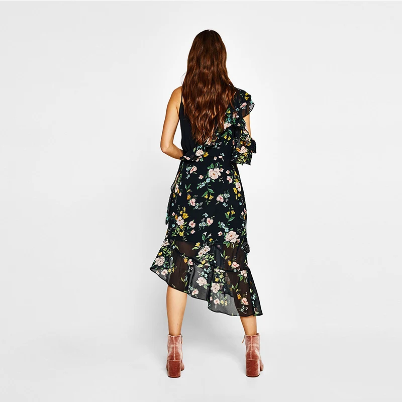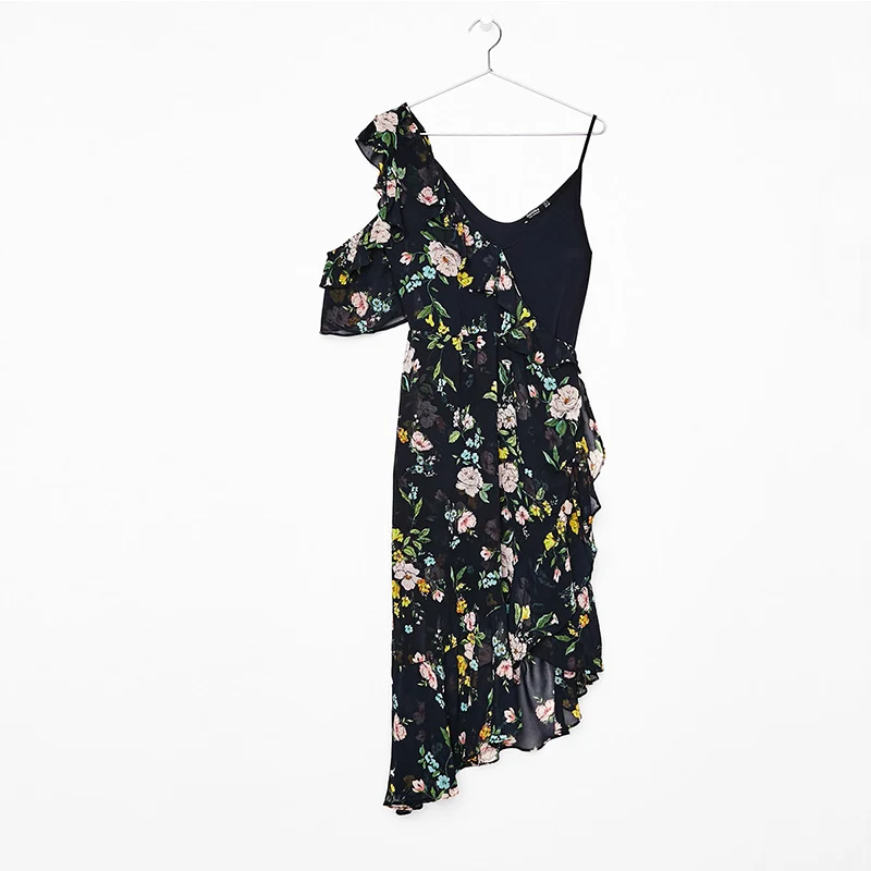 HDY Haoduoyi Women Casual Asymmetric Floral Print Patchwork Strap Midi