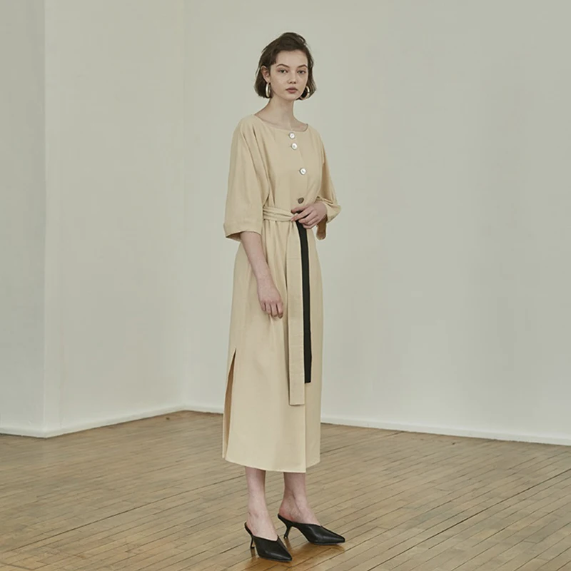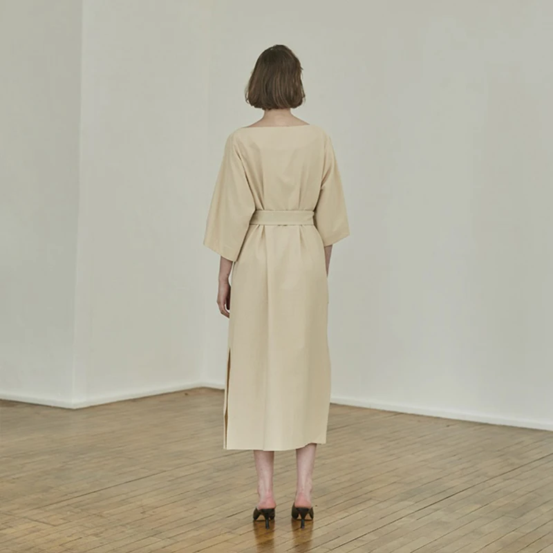 Waist Tie Midi Dress Office Lady Side Slit Autumn Dress