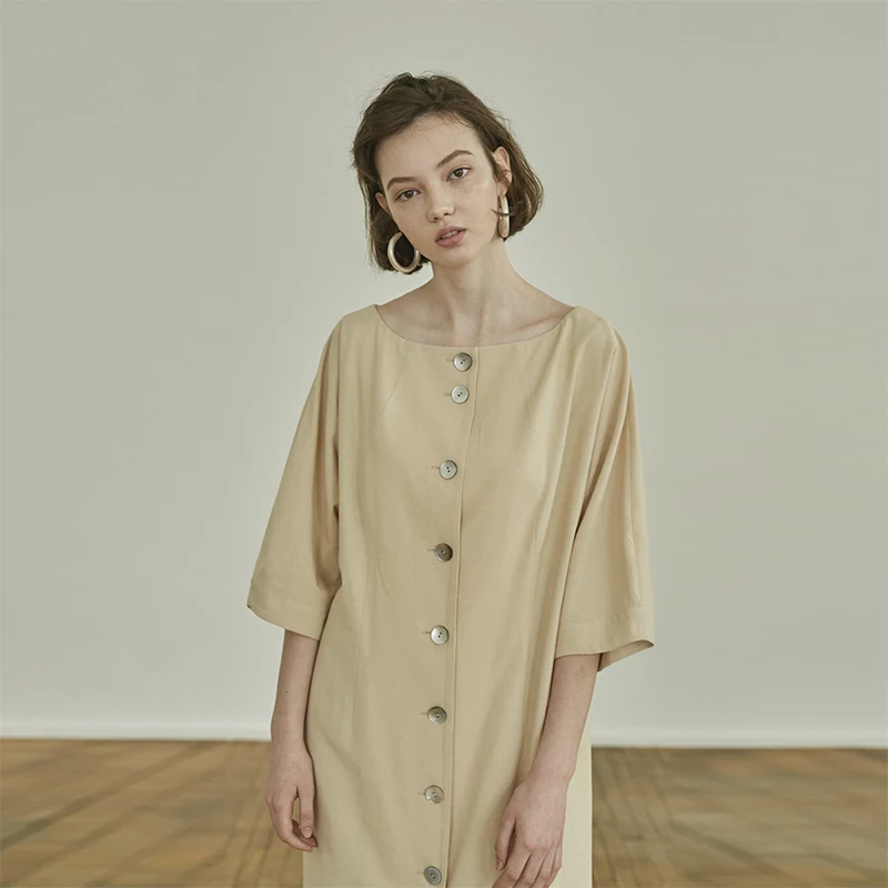 Picture for HDY Haoduoyi Women Solid Single-breasted Lantern Three Quarter Sleeve Waist Tie Midi Dress Office Lady Side Slit Autumn Dress