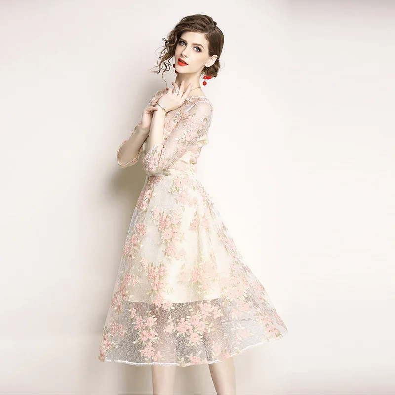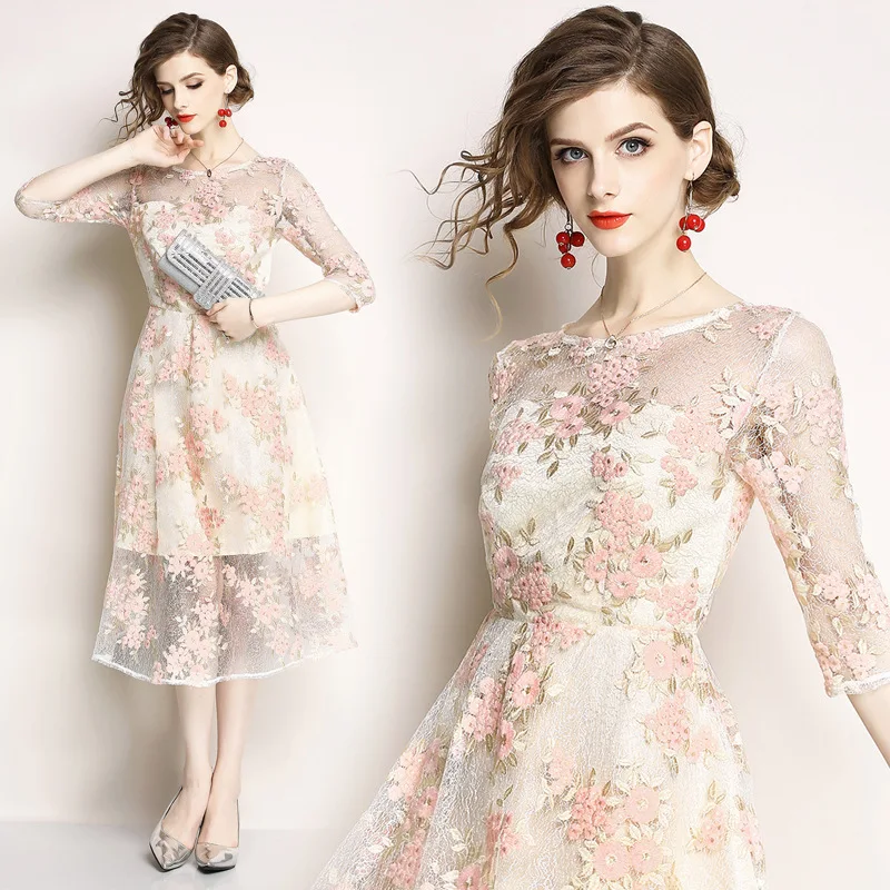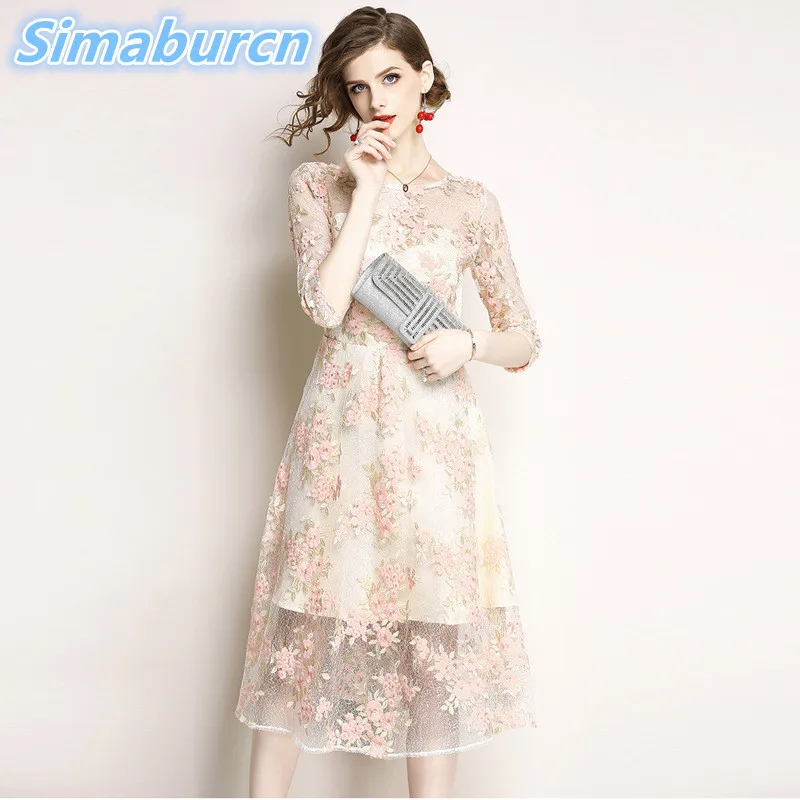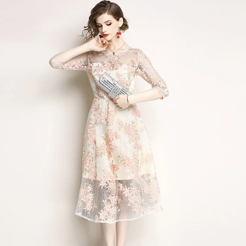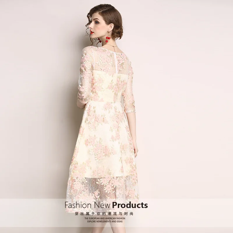 Picture for High Quality Lace Dress Women Summer 3/4 Sleeve Dresses Sexy Hollow Out Embroidery Robe Female Sping Casual A-Line Dresses Lady