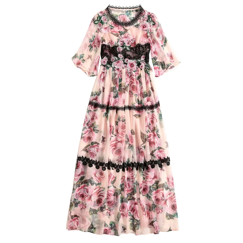 Sleeve Rose Floral Print Lace Mesh Sweet vestidos verano