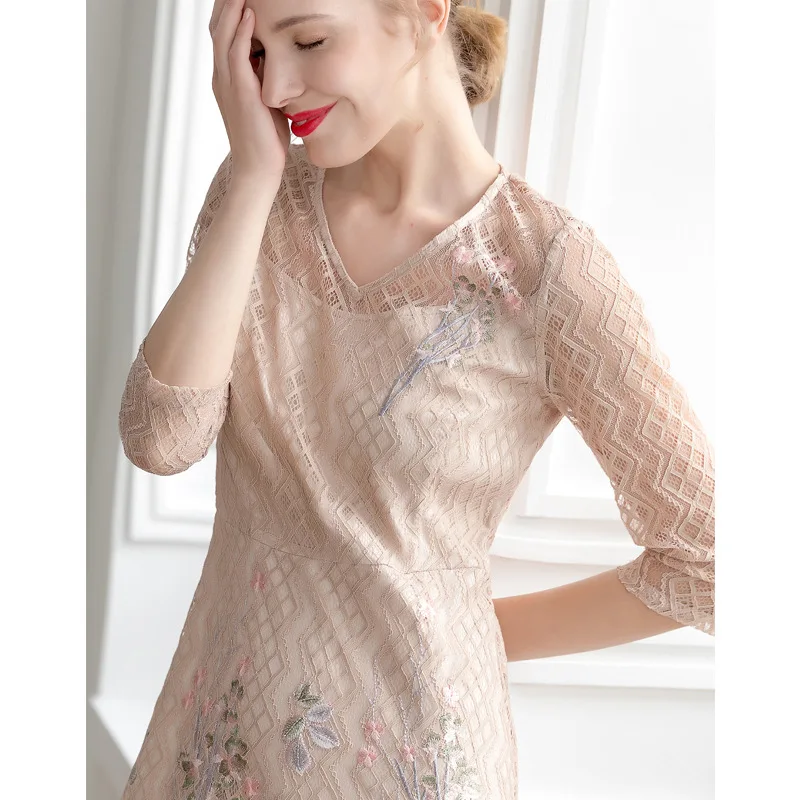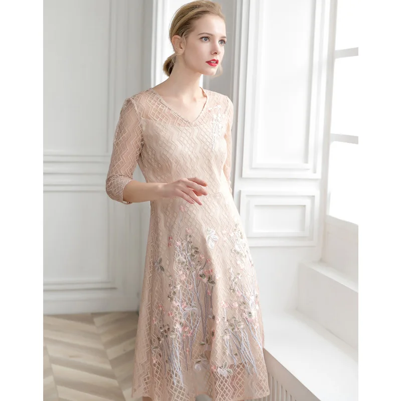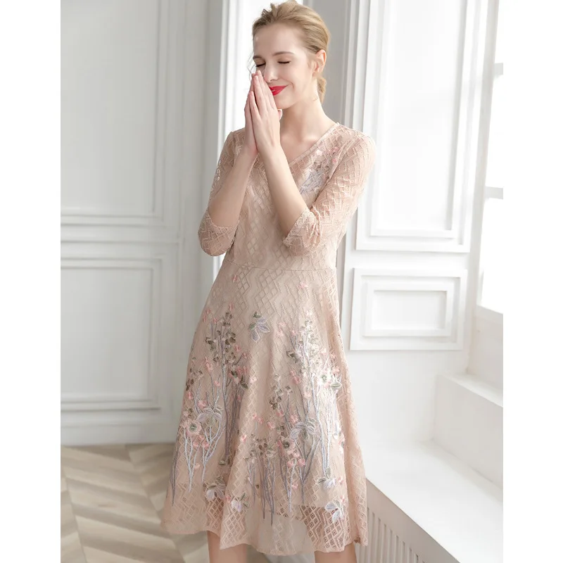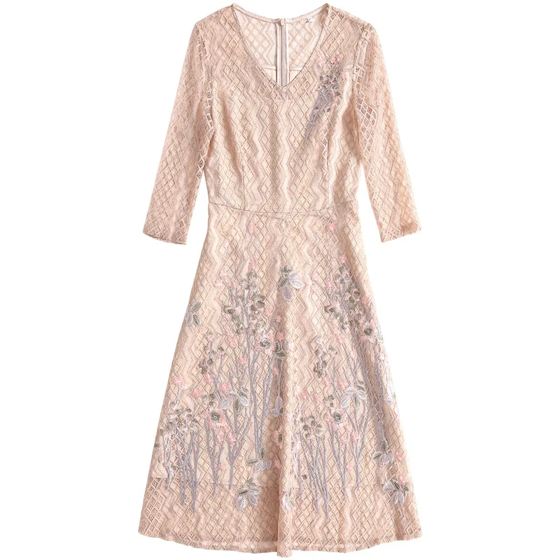 Picture for PIXY Embroidery Elegant Midi Dress Women Summer Office Dresses Ladies Vestidos Omighty High Quality V Neck Print Clothing Beige