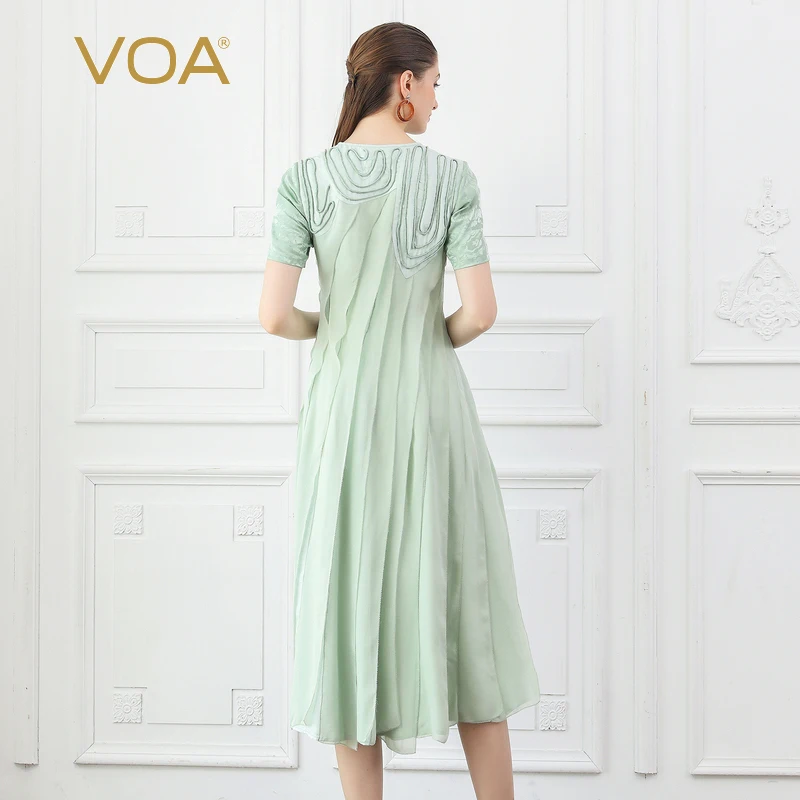 Picture for VOA 100% Silk Midi Dress Women Mint Green V Neck Mori Girl Summer Pleated Dresses Short Sleeve Sweet Cute Elegant vestido A10036