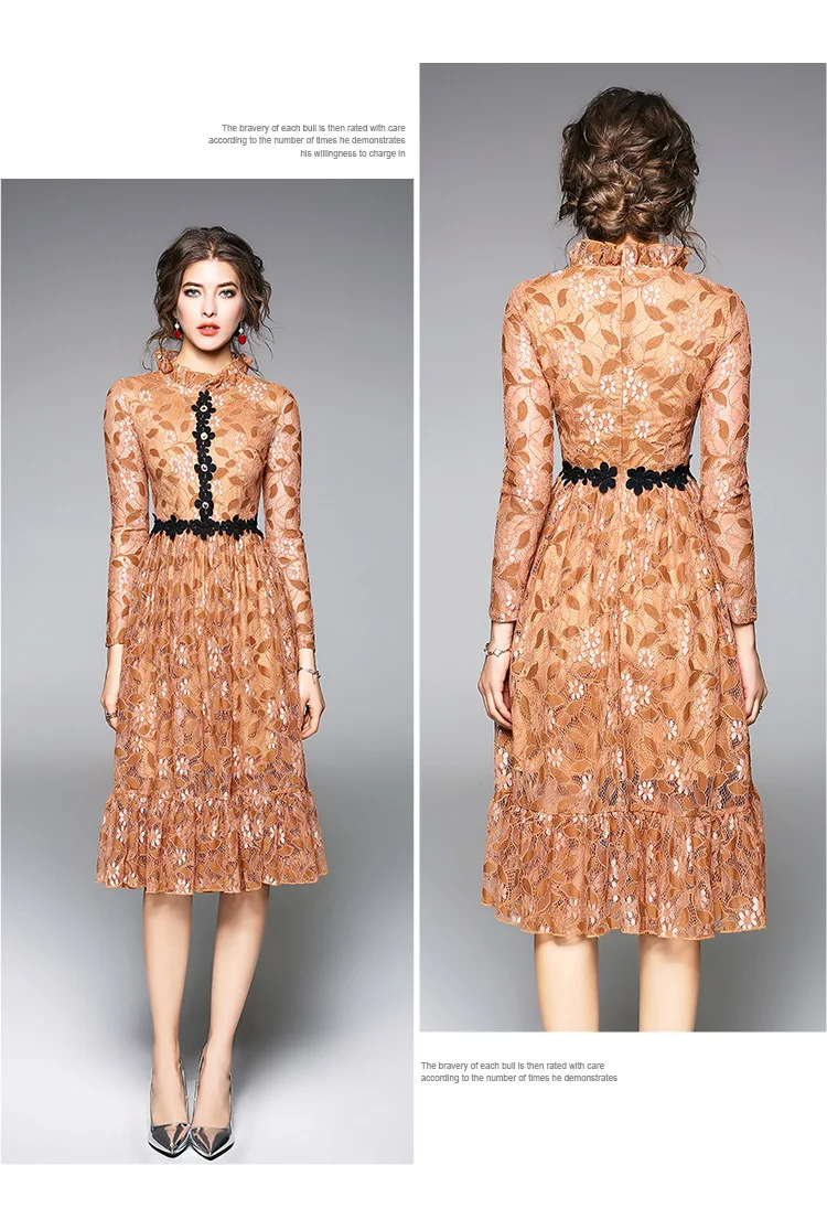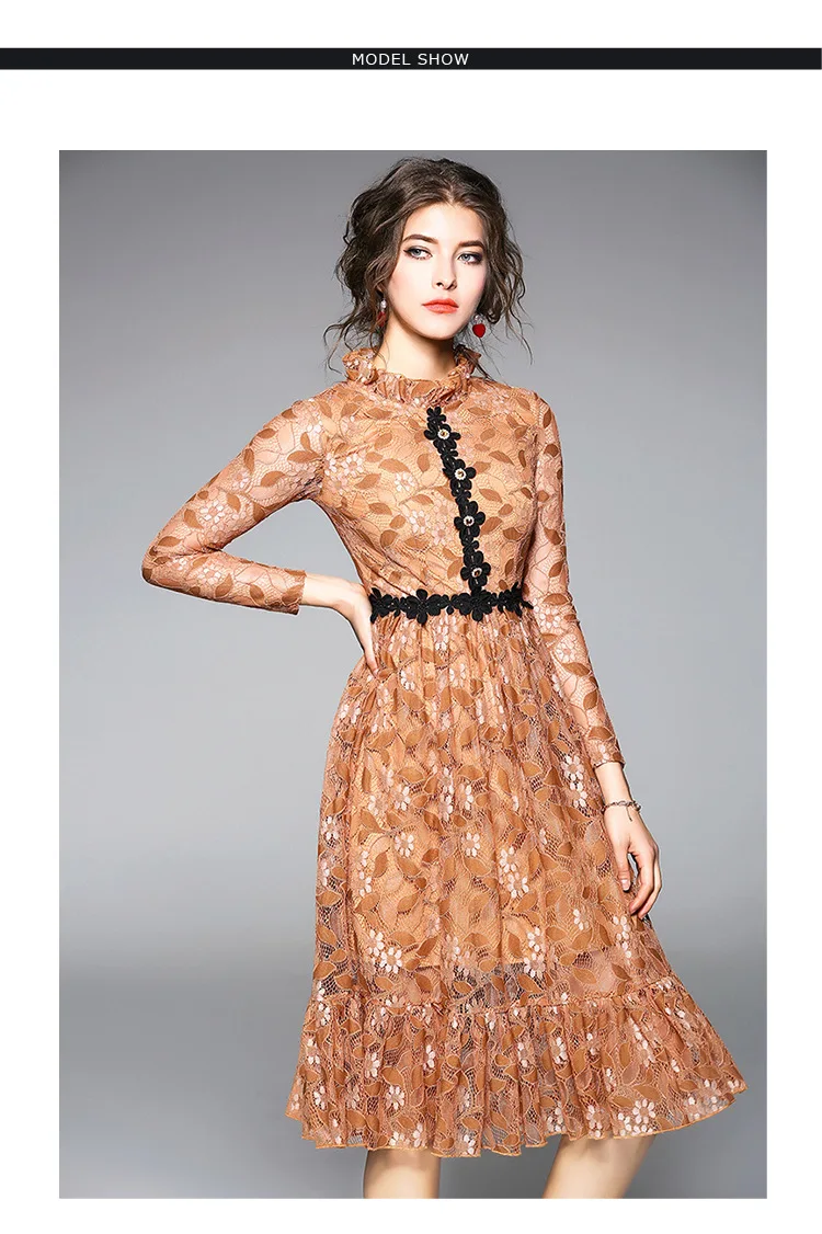 Picture for 2018 Women Spring Party Dress Stand Neck A-Line Ladies Hollow Out Long Sleeve Dress Autumn Femme Casual Lace Dresses For Female