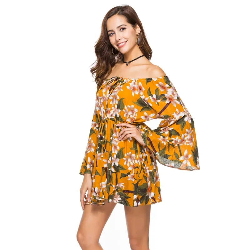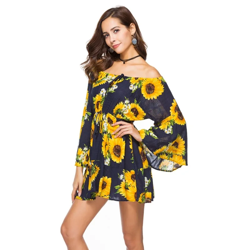 Picture for 2018 Women Summer Sexy Beach Elastic Waist Dresses Femme Casual Bohemian Printed Slash Neck Mini Multicolor Loose Thin Dress 3XL