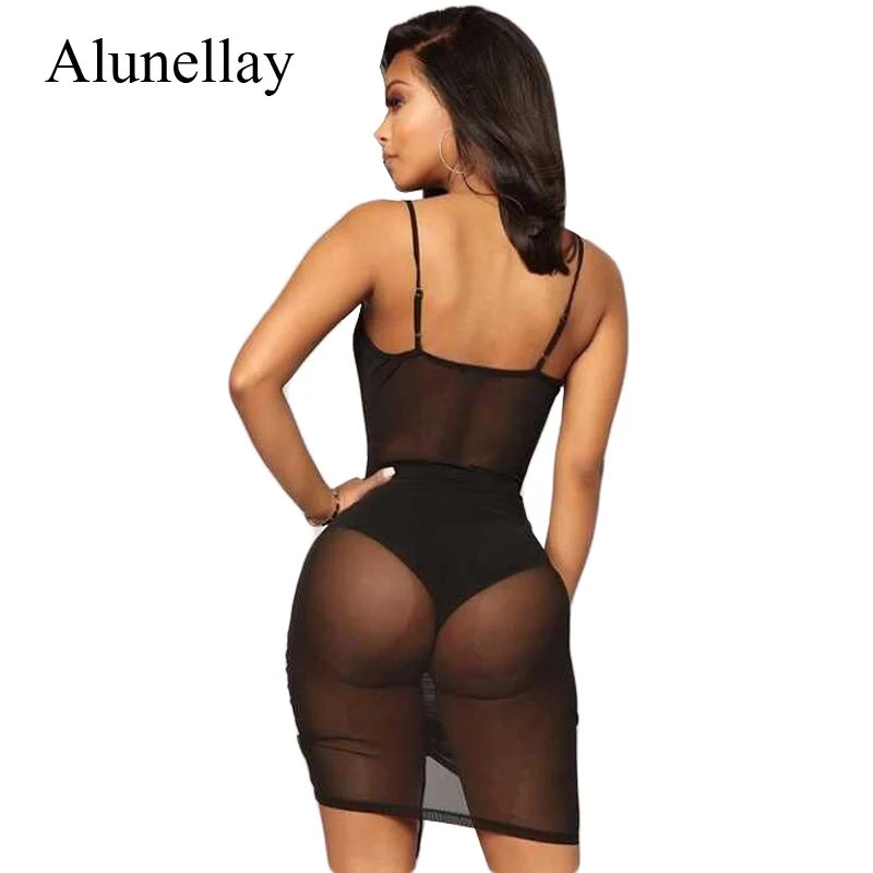 Alunellay 2018 Sexy See Through Mesh Dresses Women Spaghetti Strap