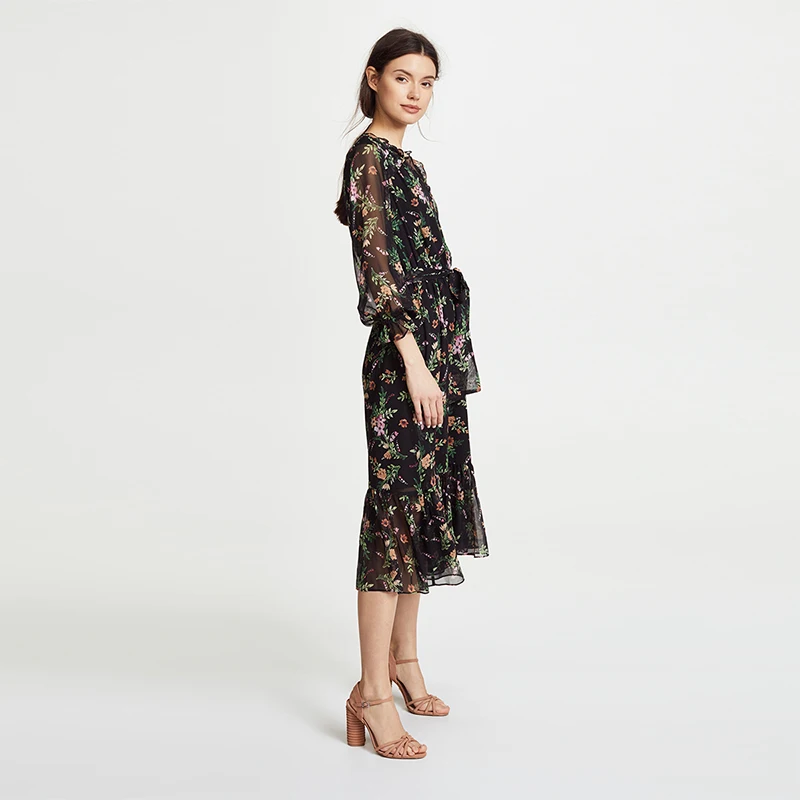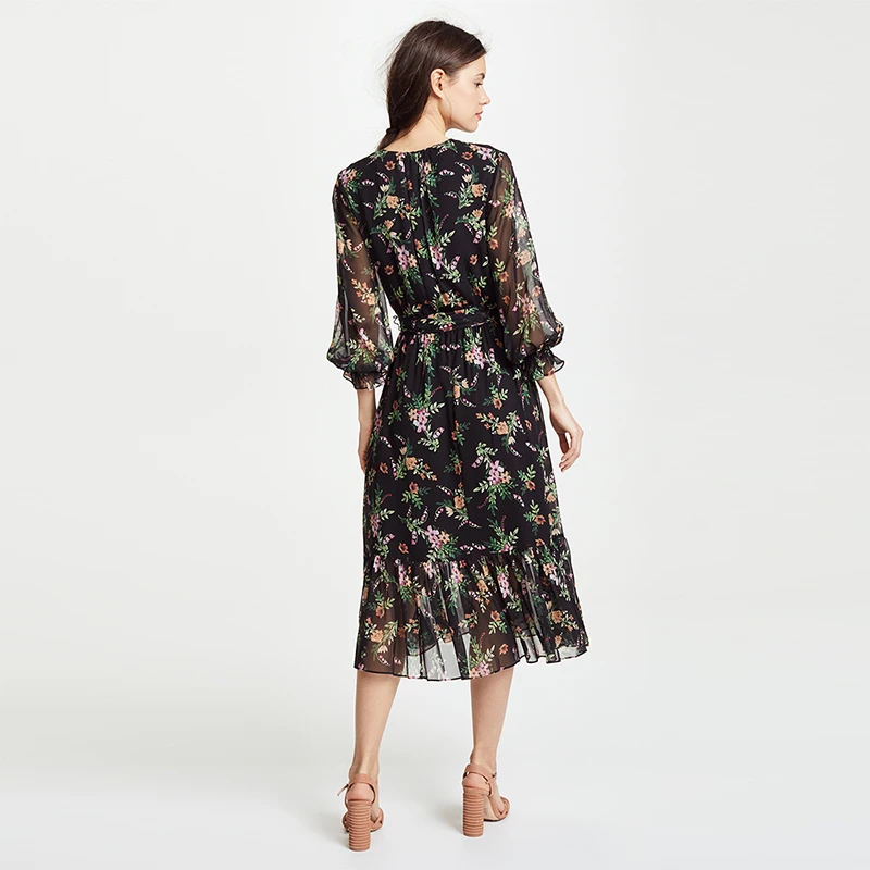 Picture for HDY Haoduoyi Printed Flower High Waist with Belt Smocking Long Falbala Sleeve Midi Dress V-neck Sweet Brief Chiffon Dress