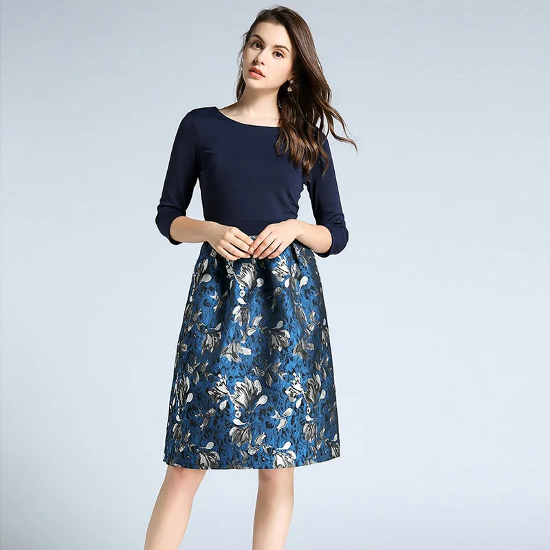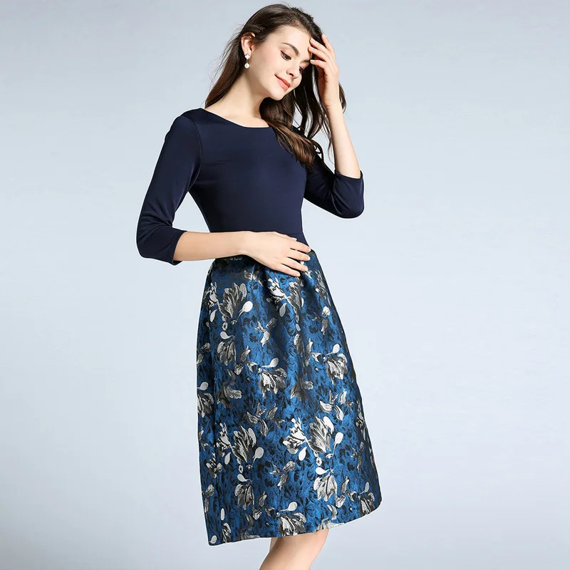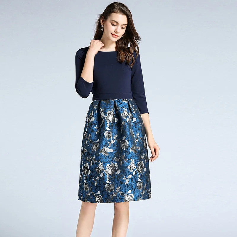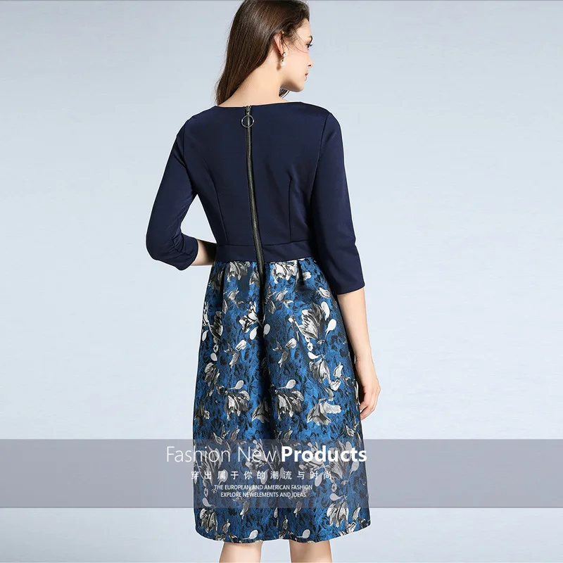 Top Quality Jacquard Dress Women 3/4 Sleeve Casual Temperament Robe