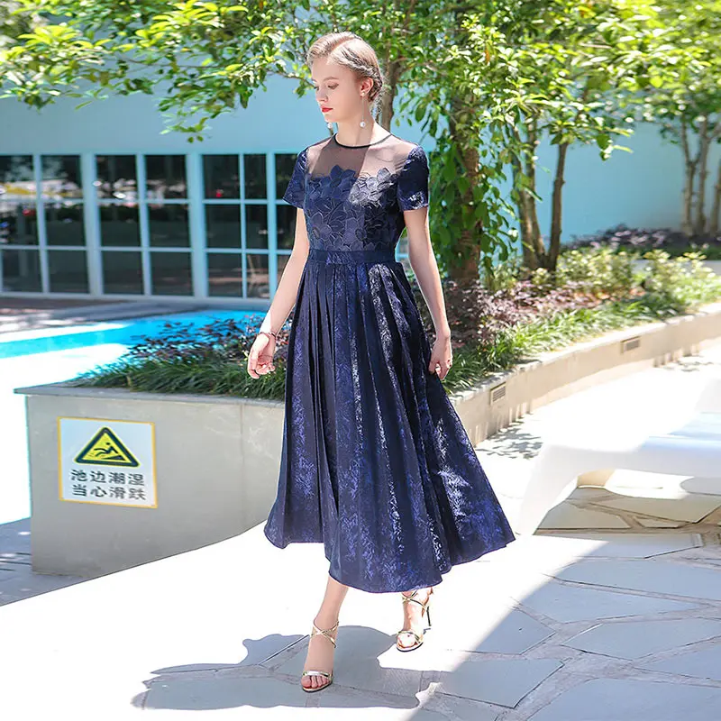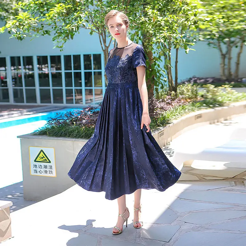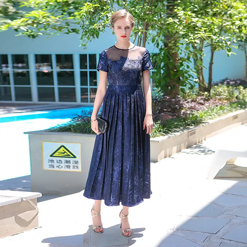 Picture for VOA 2017 Summer Navy Blue Short Sleeve High Waist Vintage Silk Embroidery Pleated Dress Plus Size Women Sexy Maxi Dress ALX02801