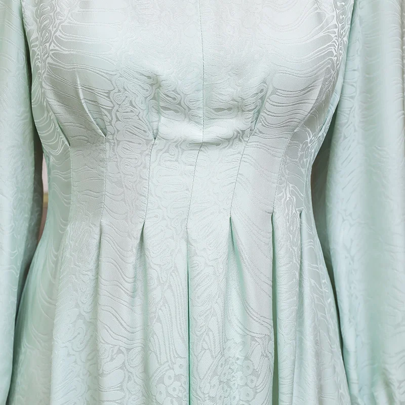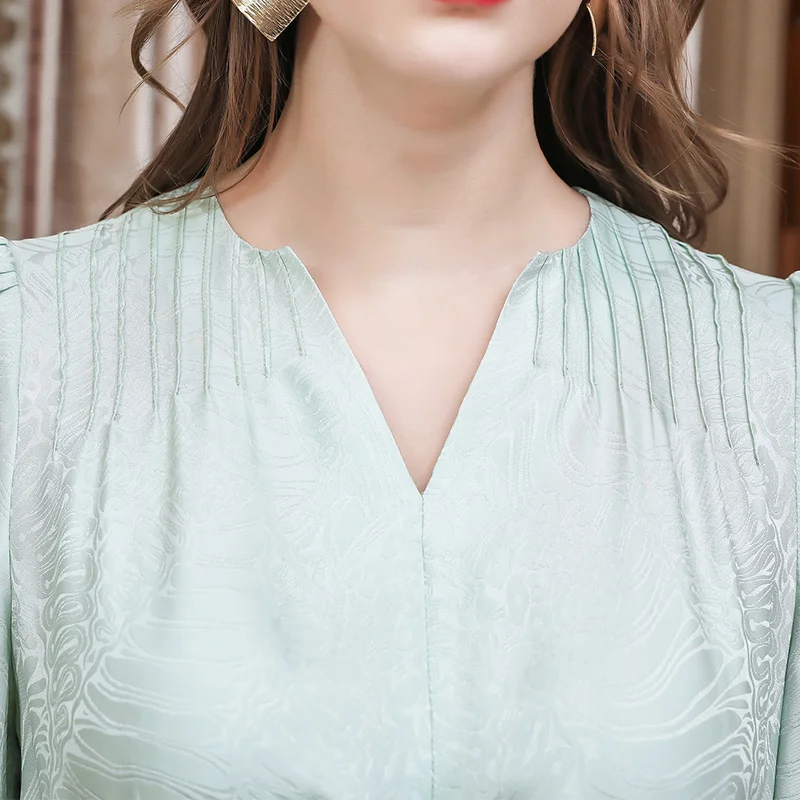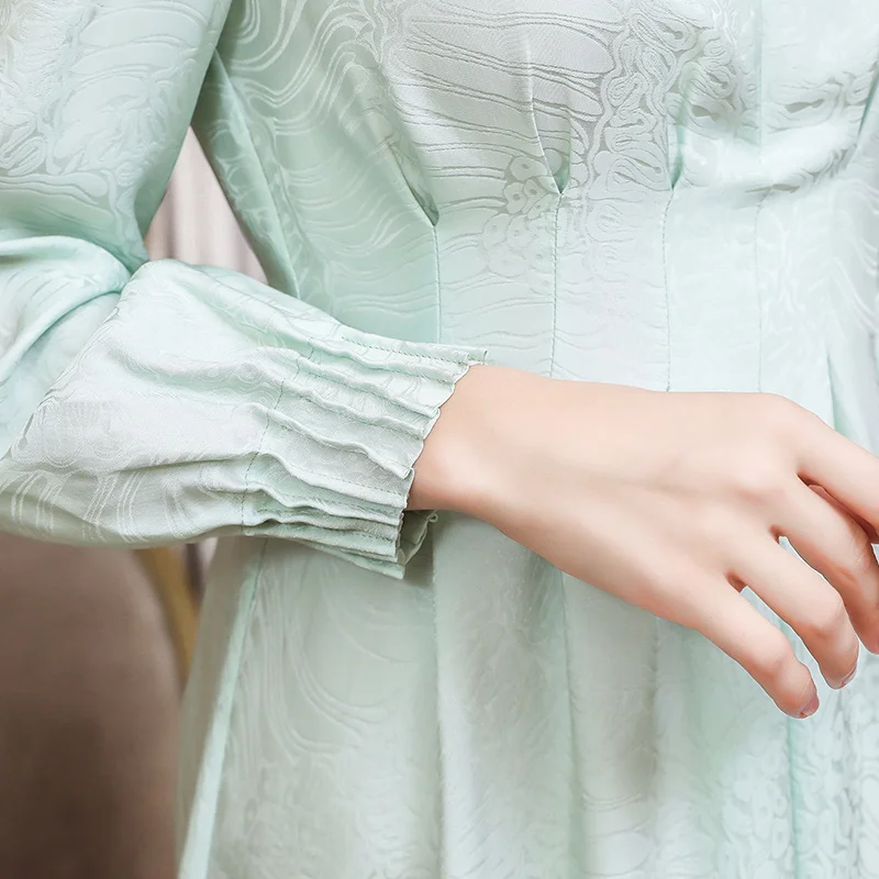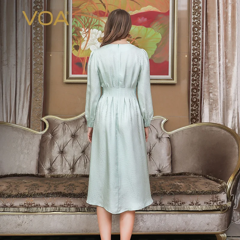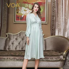 Picture for VOA Light Green Mori Girl V Neck High Waist Tunic 100% Silk Midi Dress Long Sleeve sukienki sukienka vestiti donna Sweet A10063