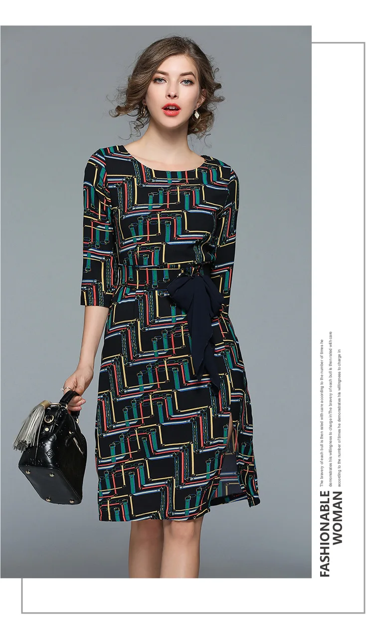Autumn Print Dress Casual Ladies Split With Belt Dress XXL